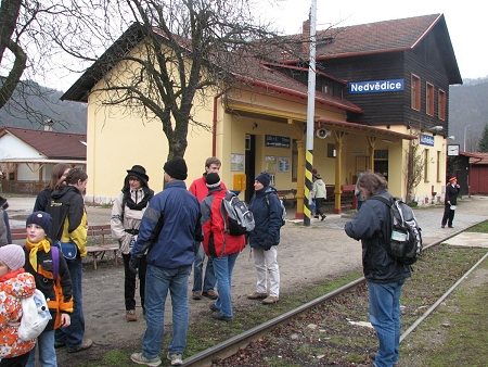 Velikonoční pondělí již tradičně patří v husovickém farním sboru výletu. Již časně ráno se účastníci sešli na nádraží a vyrazili na dobrodružnou cestu do Nedvědice. Vlak přijel na místo určení včas, což píšťalkou potvrzuje paní výpravčí (na snímku uprostřed vpravo).