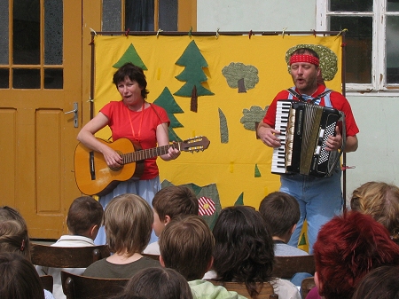 O dobrou muziku a pěknou písničku při této produkci nebyla nouze. Děti slyšely hrát akordeon, příčnou flétnu a kytaru, v závěru představení pak několik dětí stanulo před diváky jako malí hudebníci s trianglem, bubínkem, plechovkou s rýží , se štěrchadly a chrastidly. Bylo také na co se dívat: na veselém žlutém paravánu byl znázorněn les z barevných textilií, veverka Zrzečka, hříbek a pár kytiček.
