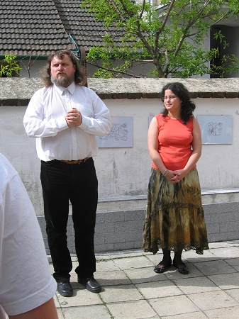 Farář Štěpán Hájek zahajuje výstavu Blancy Suris.